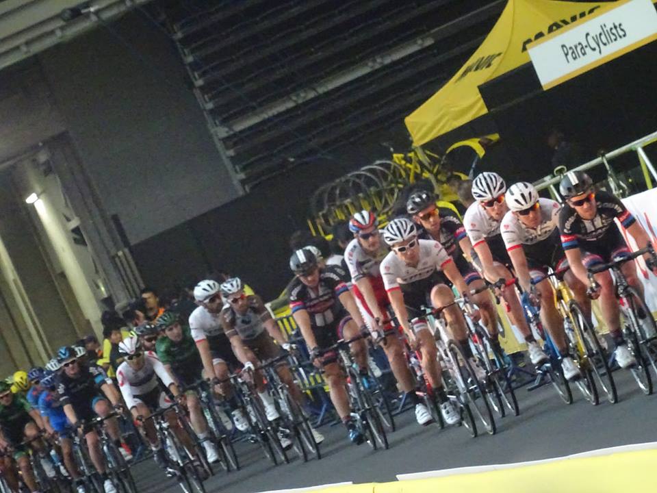 自転車だけでなく、サポートカー(乗用車ー写真左の赤。バイク)も、アリーナ内を駆け抜けます。笑う。