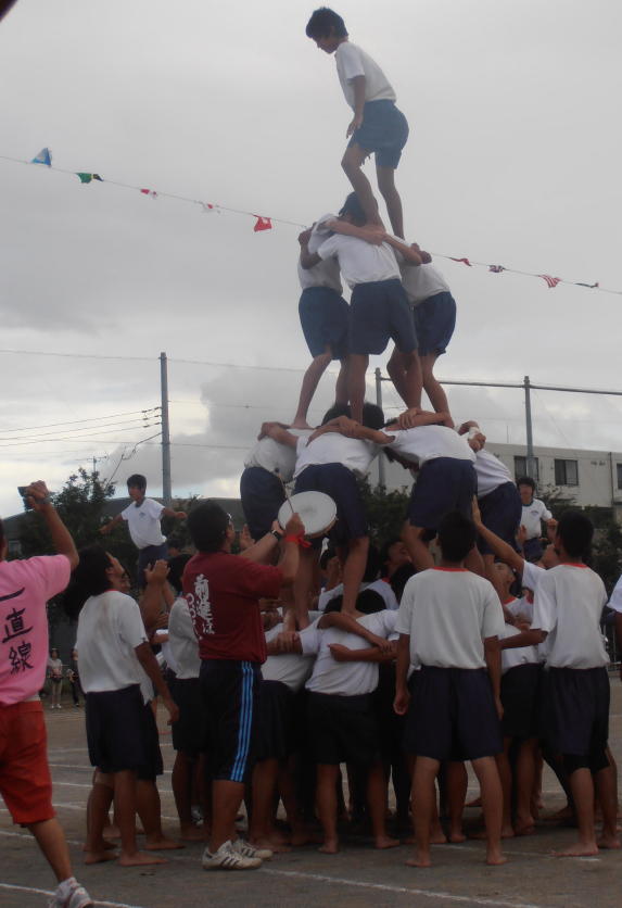 3年生の組体操。“タワー”では周りの組が成功する中、ひと組だけ崩れて失敗してしまい、