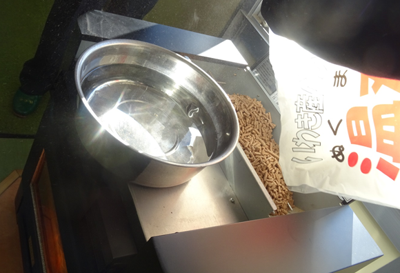 木材のチップを燃料にしたペレットストーブ(チップを入れている所)
