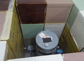 測定器を水のペットボトルが入った段ボールで覆い、他からの影響を避けている。