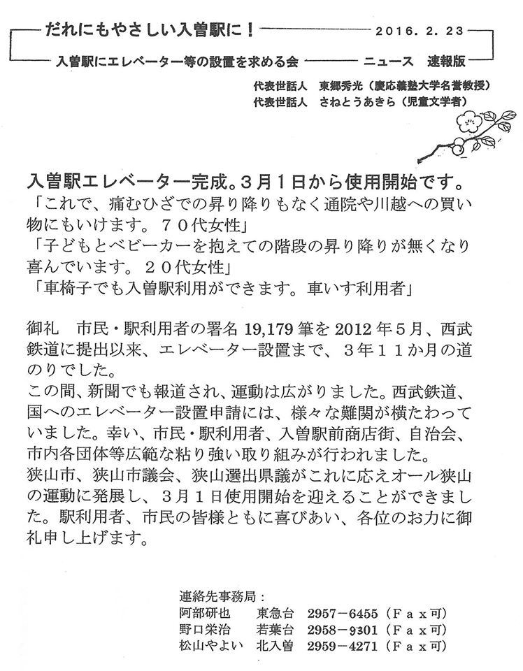 市民団体『入曽駅にエレベーター設置を求める会』の皆さんのお陰ですありがとうございます。会報に私の県議会質問の事も書いて下さいました。