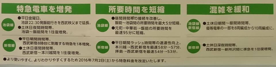 平日朝、新宿線上り通勤急行の所要時間1分短縮。特急(西武新宿8:47着)1本増発。土休日 昼間、本川越行の急行2本増発。特急1本増発(西武新宿10:49着)。土休日深夜、新所沢行の準急1本増発(西武新宿発0:01)。