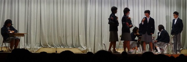 今日の集会では、いじめがどういう時に起きるか生徒自身が劇で演じて、面白かったです。男子が女子の服を着て役を担っていたのは笑いを誘っていました。
