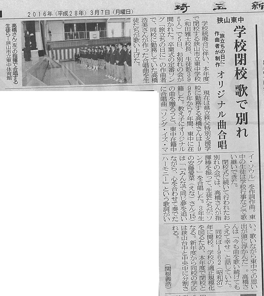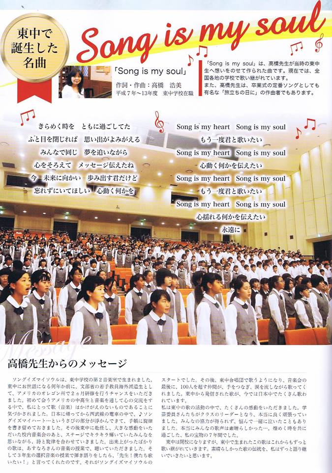 高橋浩美先生は、超有名な『旅立ちの日に』の作曲者。高橋先生が東中に赴任していた時に、上記の歌を作ったそ