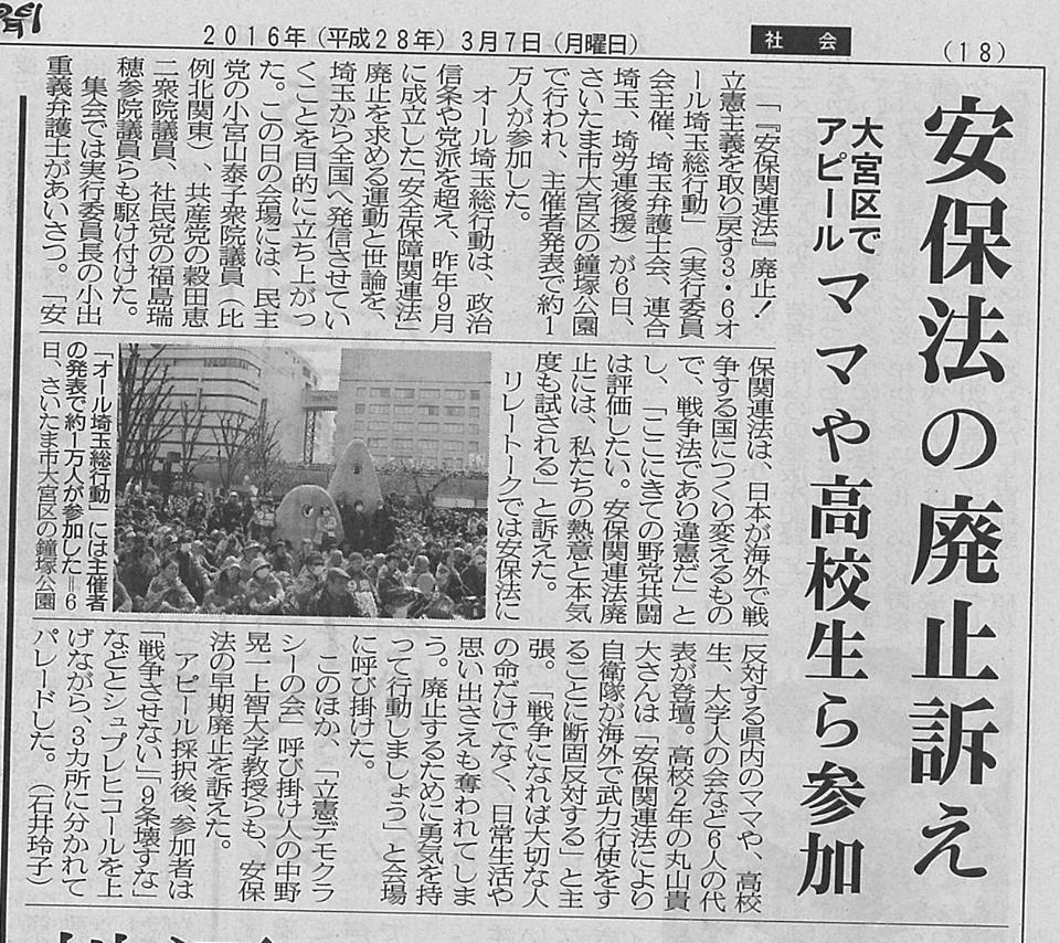 3月6日の集会について、埼玉新聞(写真)、東京新聞