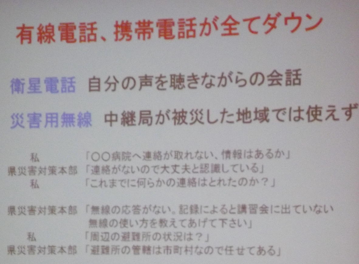 通信のダウンにより、DMATがどこに行っていいか分からなかった。救護所とDMATの間にタイムラグ。