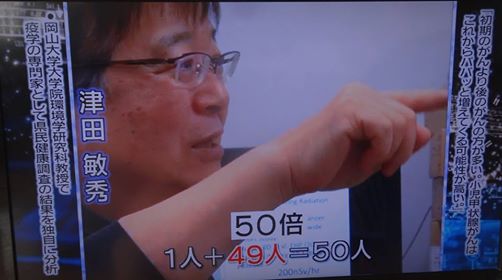 「甲状腺がんは、被ばくの無い状態では、ほとんど起きない。がん症例の分布事態が、被ばく線量の分布を表す。放射線の影響と言って間違いない。低線量であっても積算で計る。今回、20~50倍。50人が甲状腺がんになったら、49人が被ばくの影響。『100ミリシーベルト以下はガンが出ない』は完全に空説、根拠に基づかない(岡山大大学院 津田教授)」