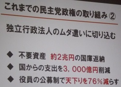 独立行政法人。不要資産2兆円を国に返納。3000億円国の予算削減。