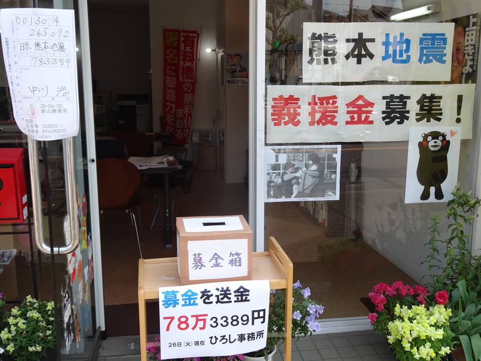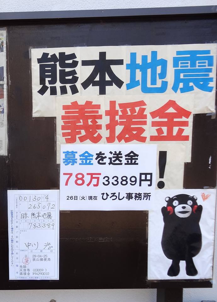 ひろし事務所前と事務所横掲示板に、現在の義援金送金額と、受領証を掲示しました。