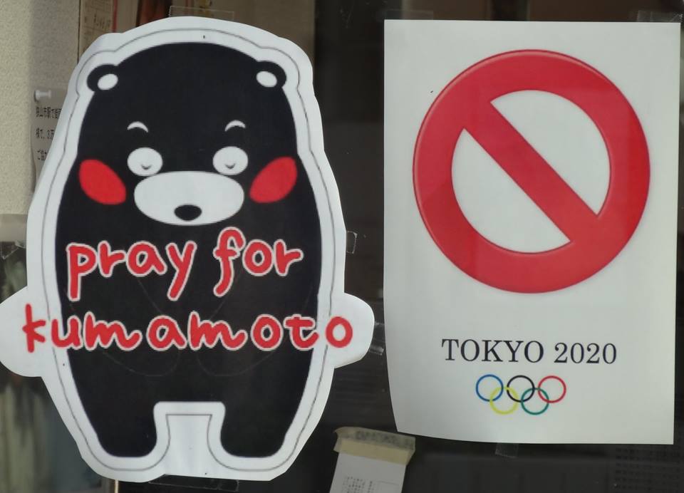 事務所前に、写真右の紙を今貼りました。オリンピックロゴ報道三昧の今日だから。