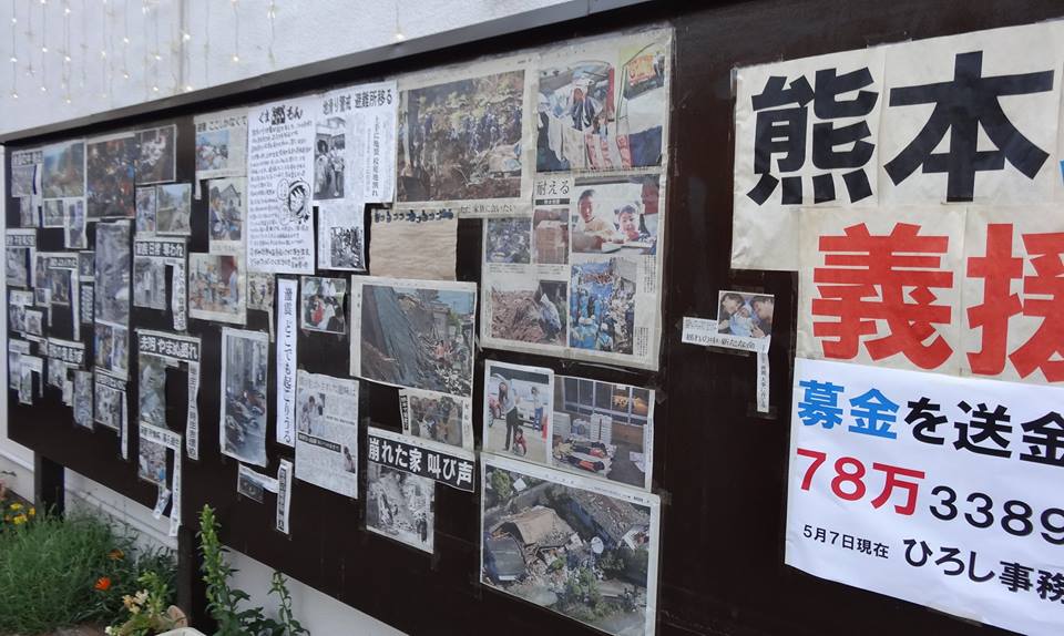 ひろし事務所脇の掲示板には、熊本地震についてこれまでの新聞の写真を掲示しています。