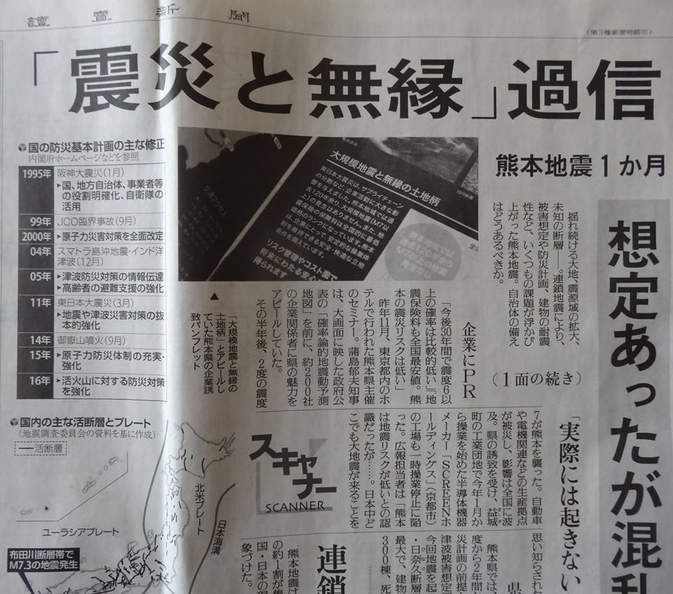 記事は、熊本地震から1カ月(5月14日)の新聞最大手の【東京版】。