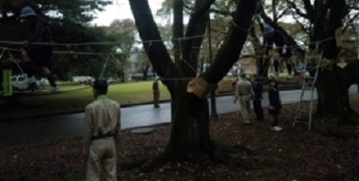 木と木の間を、ロープだけで作った橋を渡る。一般の子どもも参加できる