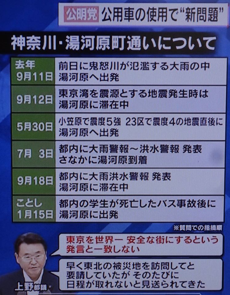 鳥取県の元知事(片山氏)は、舛添氏の災害時の行動について「知事の名前で、命令・指示を出す。少なくとも都内にいるのは絶対に必要。こんな時に他県(湯河原)に行くのは絶対あり得ない。都政に対する真剣みが欠けていた」。