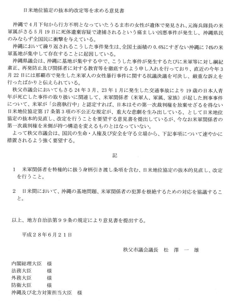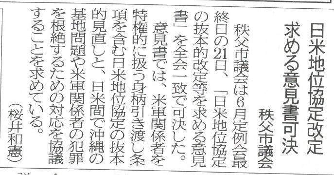 秩父市議会「日米地位協定の抜本改定求める」意見書、全文。0703_07