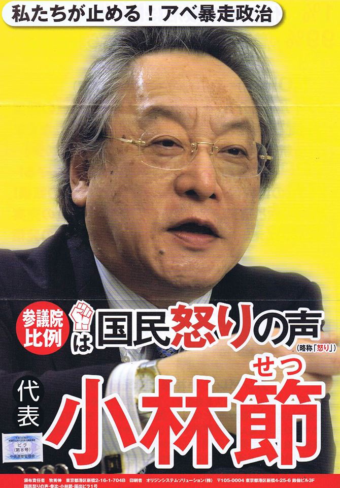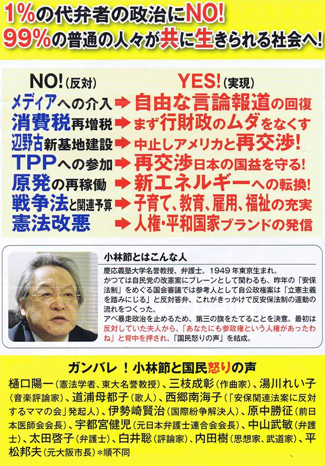 小林 節「チラシの表は、不気味な私の顔で、受け取りづらいかも知れないが、出来ない政策は書いてない」。(^^)