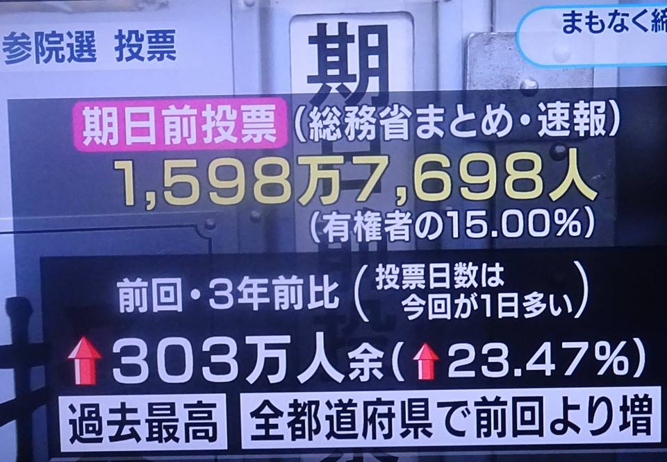 昨日(土)まで全国の期日前投票。前回比23%増。投票率で15%分。