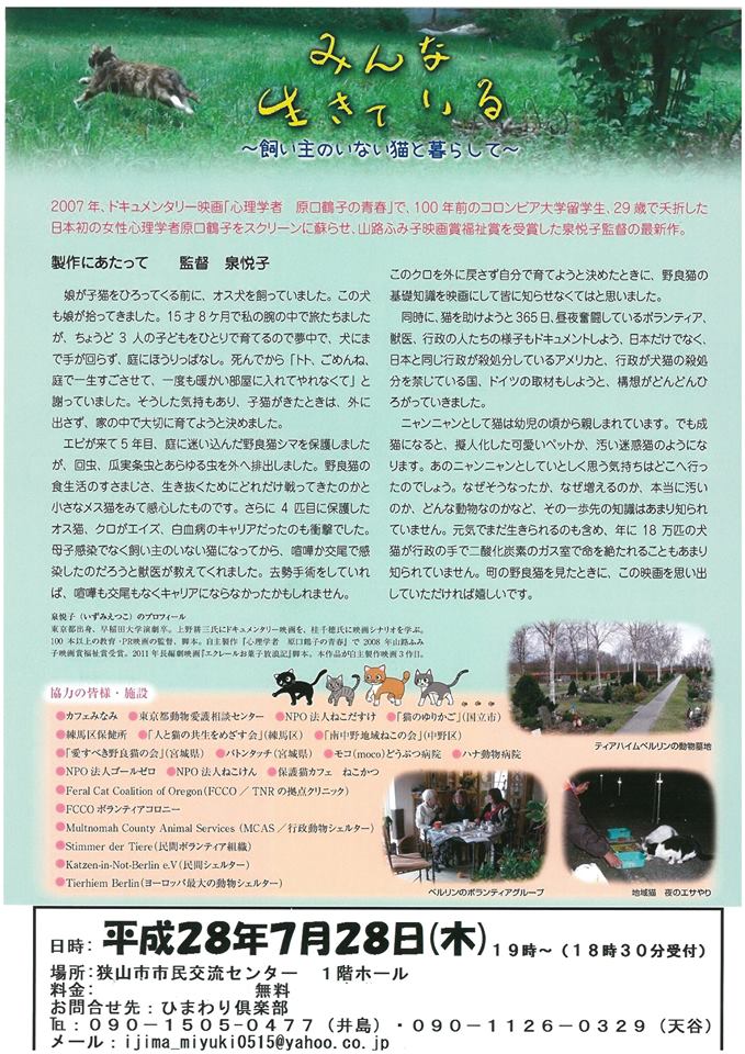 猫の無料の映画会が、あさって(木)夜7時から、狭山市駅西口前で行われます。