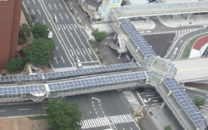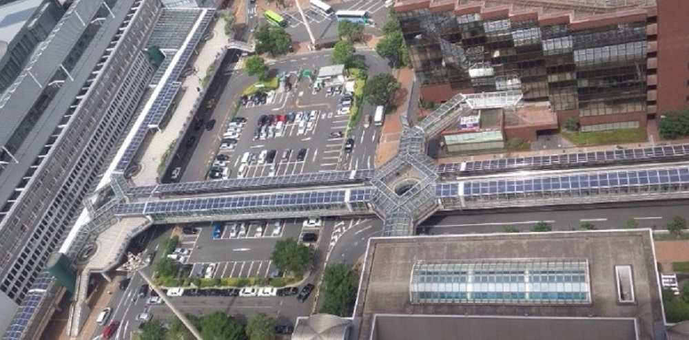 小倉駅前のペデストリアンデッキで青く見えるガラスの部分に太陽光パネルが貼られている。