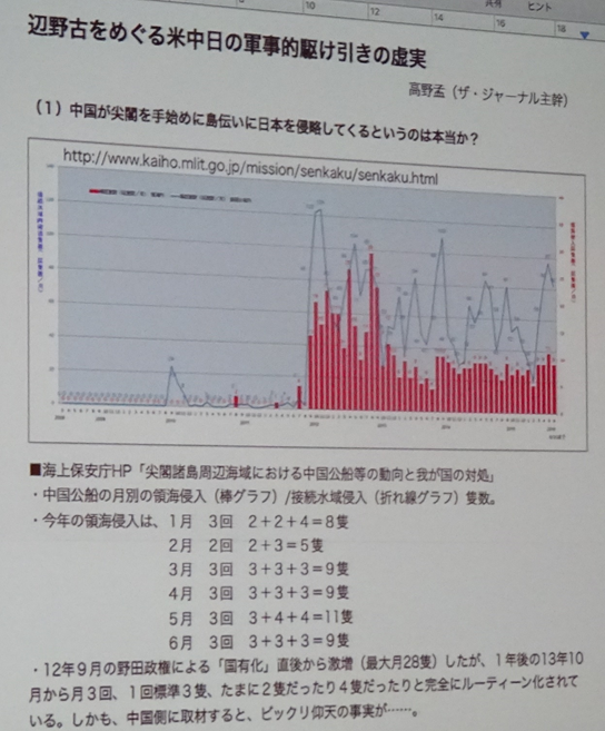 「中国船の領海侵犯が(↑グラフのように)一気に増えたのは、野田政権による尖閣国有化から。領海侵犯は月3回のルーティングだが、海上保安庁は「頻繁」と言っている。海保に中国が「明日行く」と通知するようになったのは、中国側から一方的にであり、トラブルを起こしたくないからとの事。一触即発状態ではない。中国側は尖閣の事実上の棚上げを認めている。