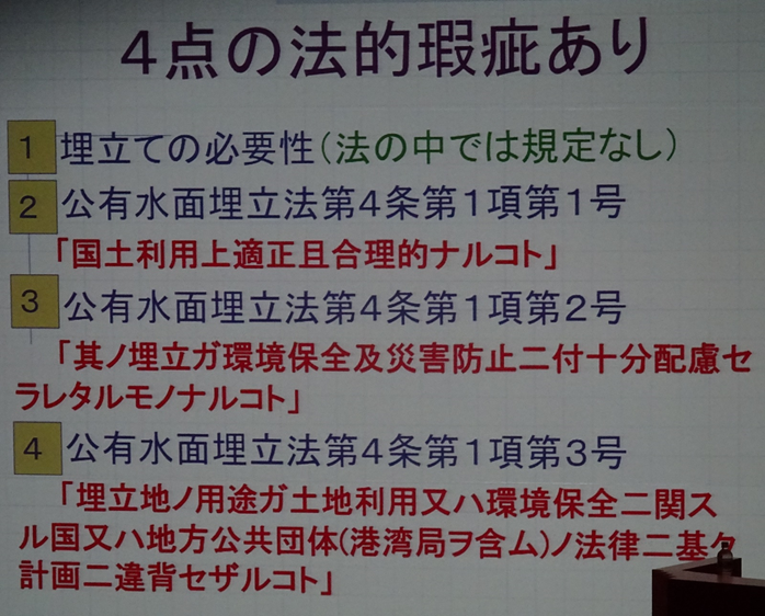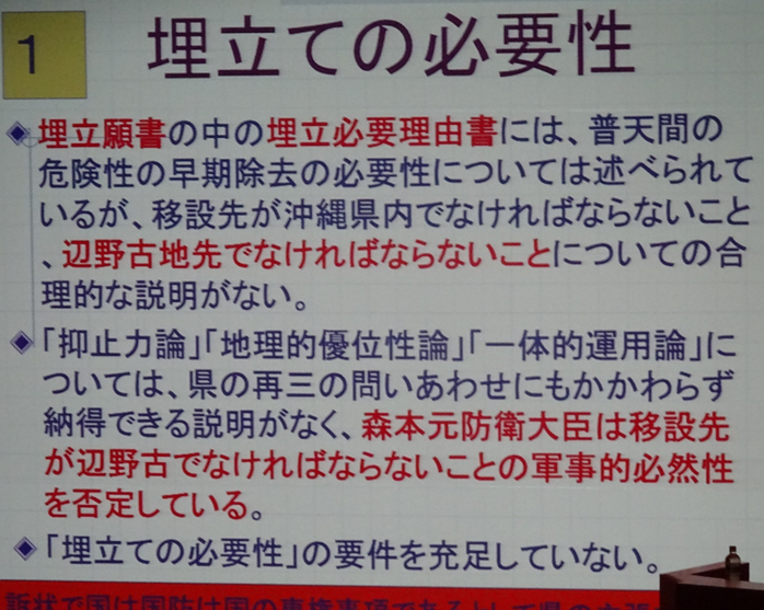 埋め立ての必要性の説明がされなければ。県内でなければならない理由が無い。防衛大臣(当時)は、軍事的必然性を否定した。