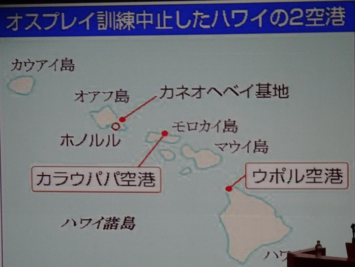 ハワイ島の空港にはカメハメハ大王の遺跡があり、コウモリがいるからオスプレイの訓練を中止。