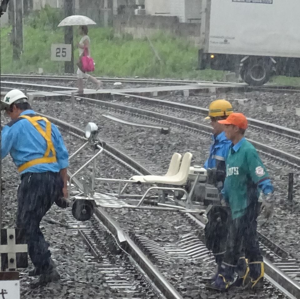 終了後の大雨の中、子供を乗せて線路を走る物を、西武の鉄道員さんが片付けていました。