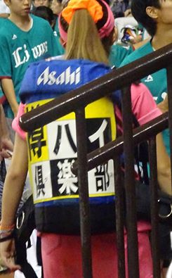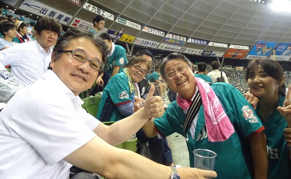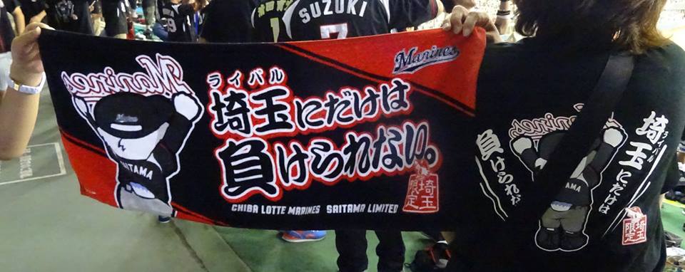 『千葉ロッテ』のファンの方がそのように書かれたタオルを持っていたので「撮らせて」と言ったら、なんとポロシャツ(右)にも同じフレーズがあり、わざわざ2人で見せてくれました。(^^
