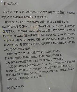 さとしが亡くなって半年がたった頃、初めて夢を見ました。私がさとしの手足をさすって、一生懸命あたためていたら目をさまし、「おかあしゃん抱っこ」と 言って、ニコニコしながら立ち上がりました。あ~生きてるんだ。死んでないんだと思い、もう少しで抱っこ出来る所で、夢はさめてしまいました。毎日泣いて ばかりで、笑顔になれない母に笑って欲しかったのだと思います。今も心の片隅で、思い続けてしまう事があります。「提供者が見つかり、骨髄移植が出来てい たかも知れない。生きる事が出来たかも知れない」と・・・。