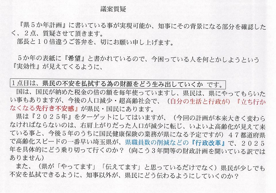 埼玉県『5か年計画』の議案で、県議会で今日質問した、もう1つは以下です。