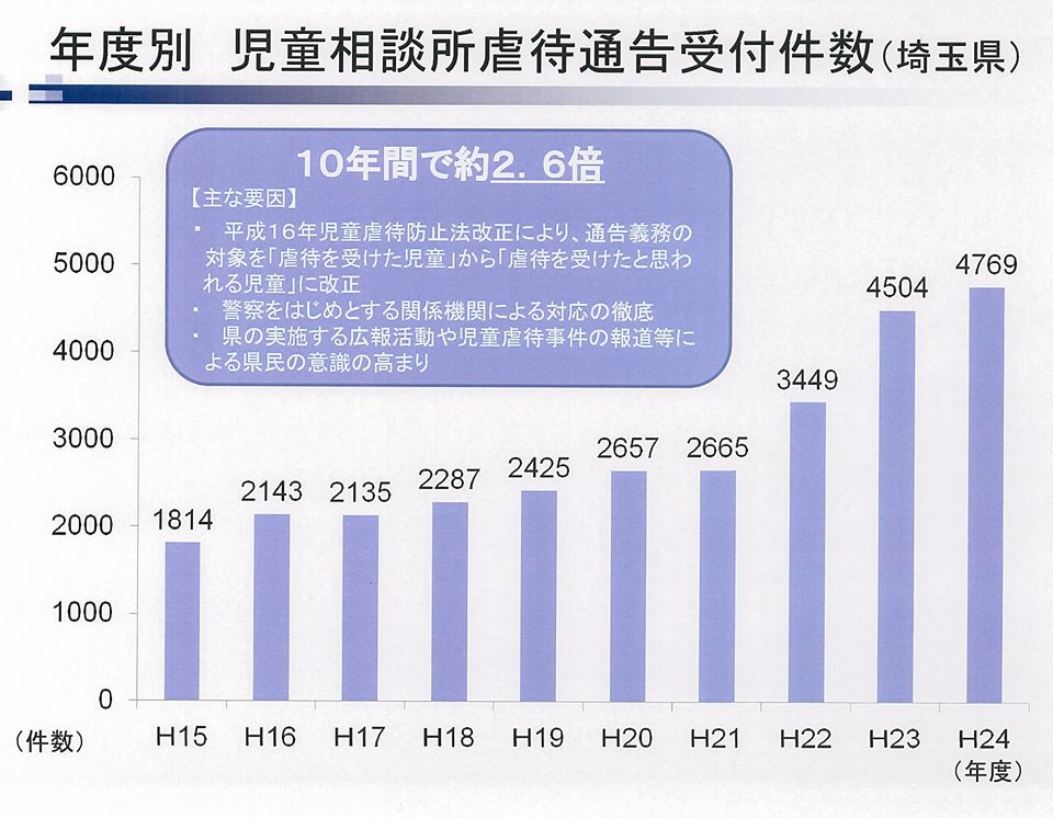 児童虐待の児童相談所への通報は、10年間で、2.6倍に増えているというのが、この資料です。