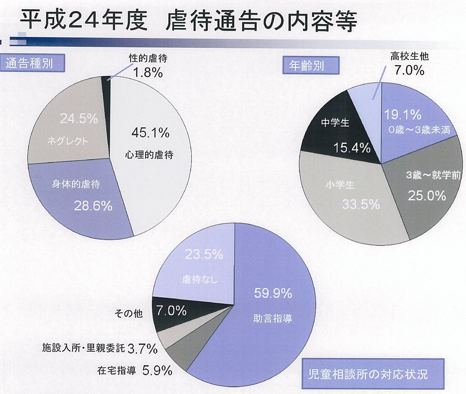 児童相談所への虐待通報のうち、23.5%は虐待ではなかったと判断したもの(円グラフ3つのうちの下)。