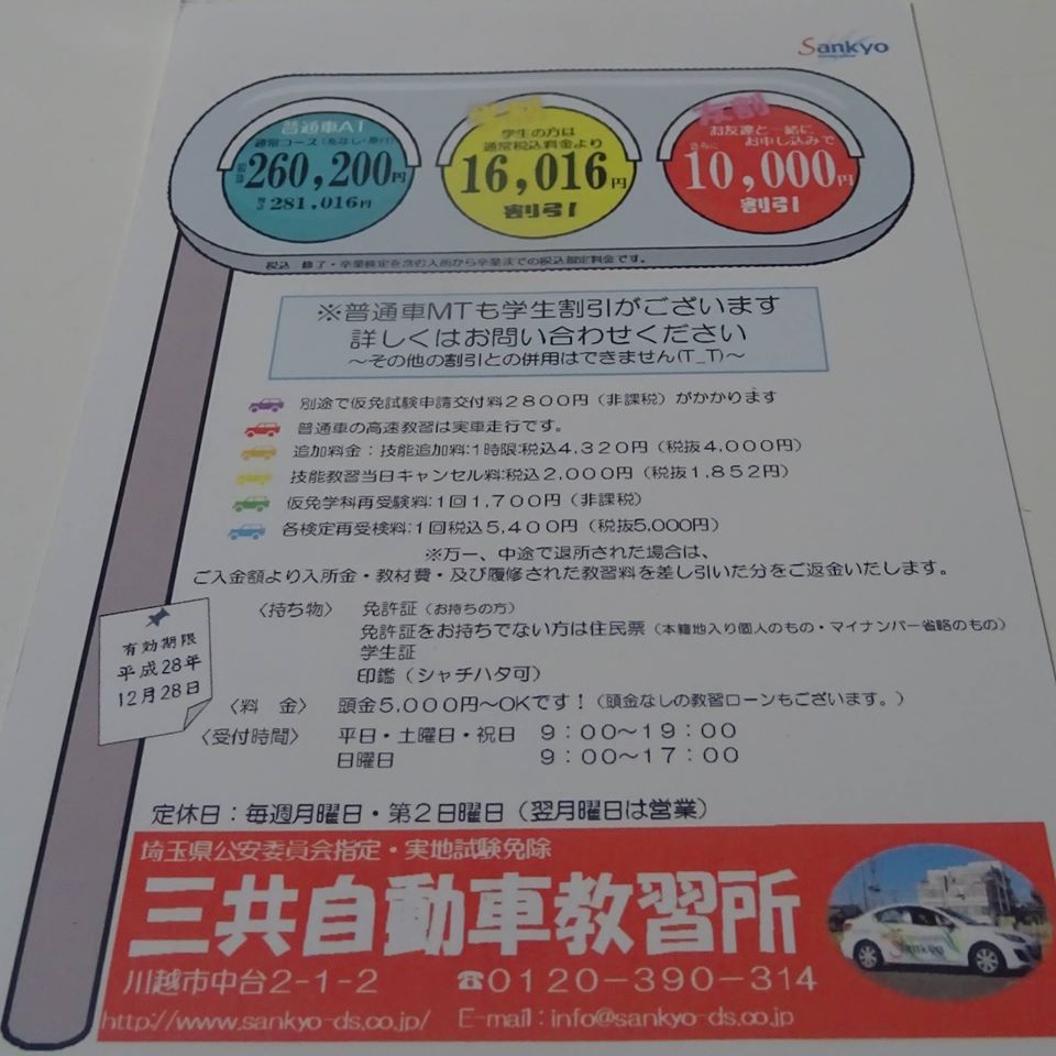 三共自動車教習所(川越)からのダイレクトメールが、18才の誕生日の3か月少し前に(教習の申し込みが3カ月前から出来る)。写真が現物です。