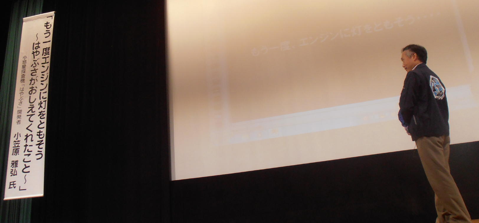 式典後の記念講演会で、小惑星探査機「はやぶさ」と月周回観測衛星「かぐや」の開発者(姿勢軌道制御開発部門長)の小笠原雅弘氏が講演。