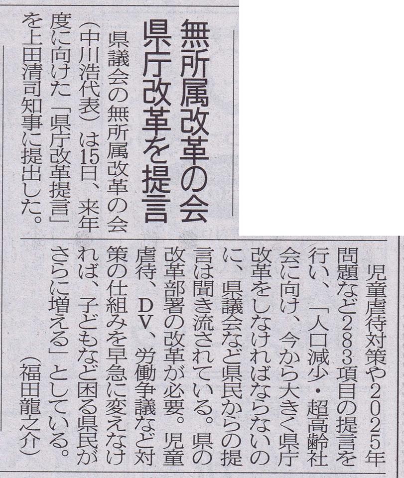 私ども会派で上田知事に提出した『県庁改革提言』が、翌朝の新聞に載りました。