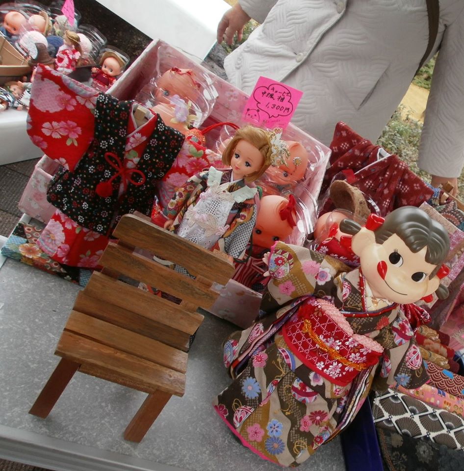 リカちゃん・バービーなど、市販の人形に着せ替えられる着物。(お聞きしたところ、やはり)外国人の方のほうが関心を持たれ、派手な色の物が好まれるとの事。材料費が800円かかり、売値が1000円。細かく丁寧に作られており、都内まで生地を仕入れに行かれて、事実上は利益度外視なのが、有難いです。ご年配の方がいなくなったら、作れる方はいるのでしょうか?と思ってしまいました。