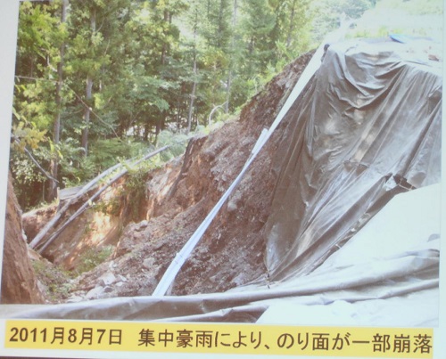 八ツ場ダム建設による住宅移転予定地の、のり面の盛り土が、東日本震災で現場は震度4と強くなかったが、崩れてしまった。