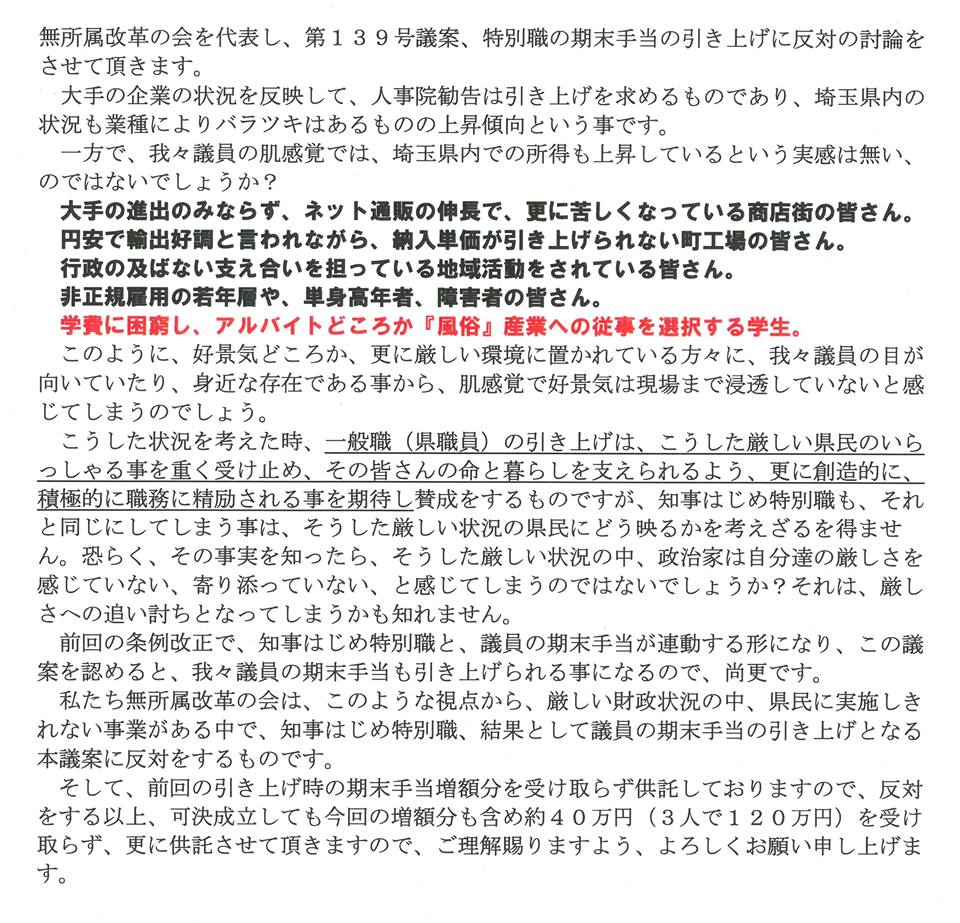 私の所属する会派の木下博信県議(草加)が県議会で反対討論した原稿。お読み下さい。
