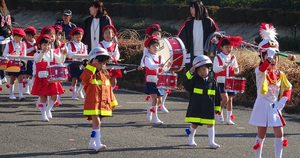 保育園のちびっ子が、敬礼しながら行進。
