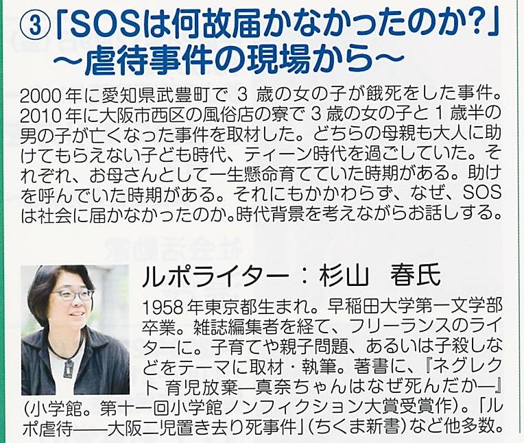 『SOSはなぜ届かなかったか?~虐待事件の現場から』講演会。杉山春氏(ルポライター)(狭山ひまわり倶楽部主催)。