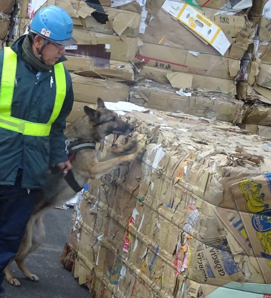 【段ボールの異臭をかぎ分けるワンちゃん】