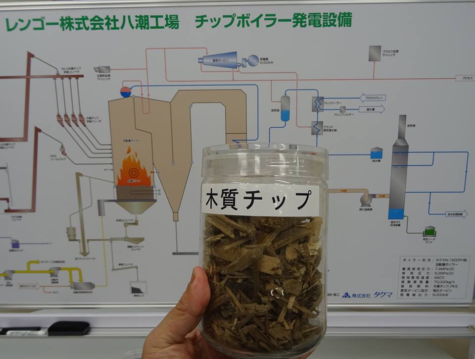 【(家の解体や家具の)廃材チップ発電(写真)】とバイオマス発電で、レンゴー株式会社は、段ボール製造工場で使用する7割を発電し、排熱も利用している(昼間は9割)。