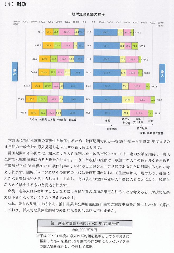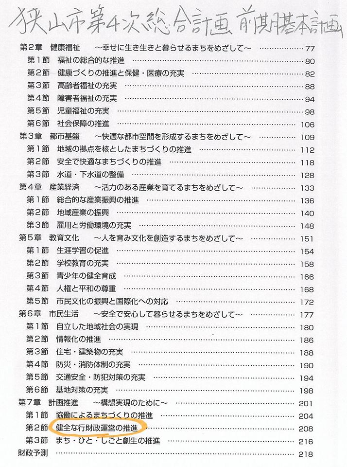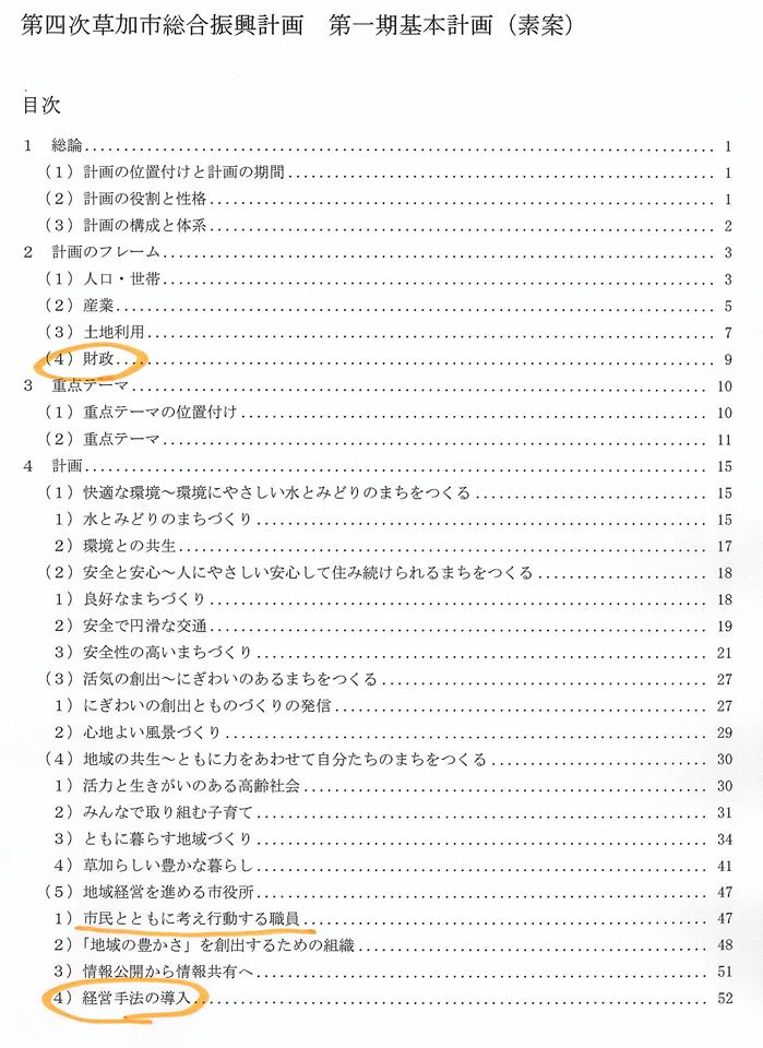 県庁の案に欠けているのは、【財政計画と行政改革】で、草加市(写真)にも狭山市にも、あります。知事は「県は市町村の兄貴分」と口にしていますが、県職員はそうなっていない。