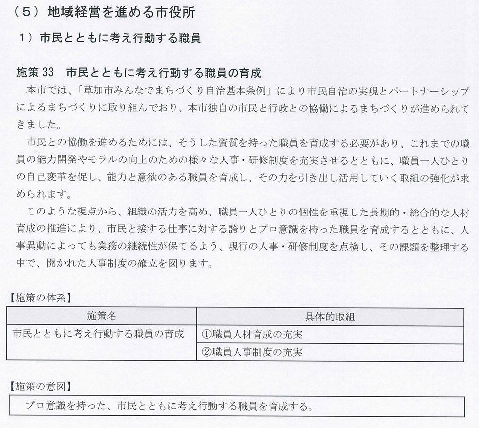 県庁の案に欠けていて、草加市の計画にあるのは『市民と共に考え、行動する職員』というページです。(中身はともかく)