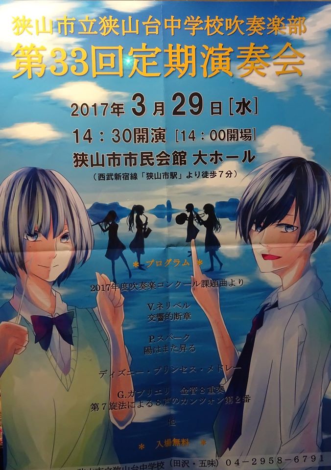《狭山台中 吹奏楽部 演奏会 29日(水)2時半~ 市民会館 入場無料》