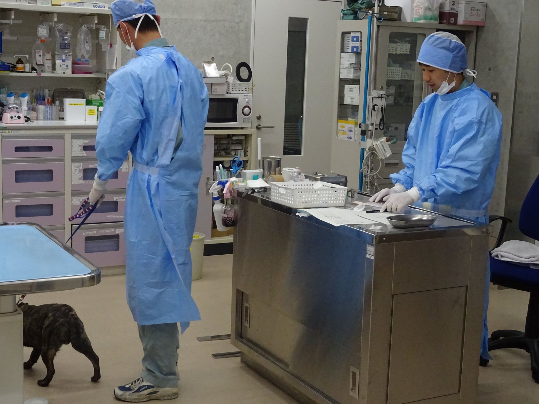 京都市内に2カ所あり、獣医師会が運営。こちらは医師3人くらいで当番しているとの事。すごい。お邪魔した昼間、去勢手術が行われていました。