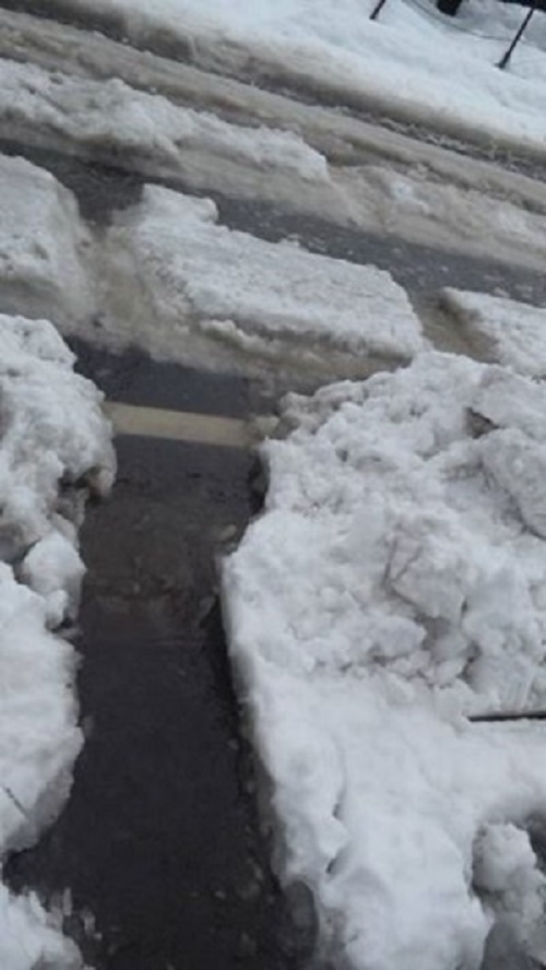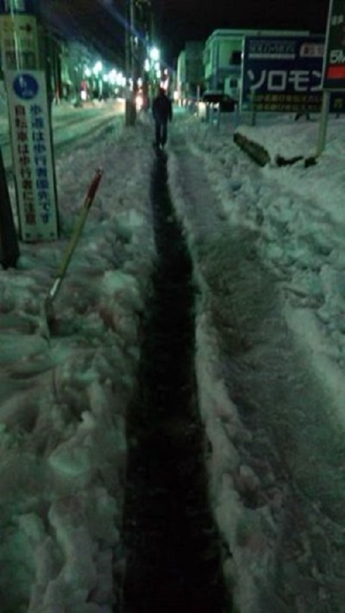 人は歩道でなく、車道を歩くので、車道の2本の解けた所の氷水を、側溝に流す(水たまりになってしまうので)。ちょっとでも氷がたまっていると、意外と流れない。