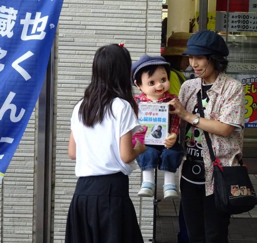 駅の乗降者の前で腹話術をやって頂いたので、見るのが初めてな方が多く、子供も大人も目を丸くして見ており、募金する方は、カオルちゃんを選んで募金されました。ほっこり。(^^