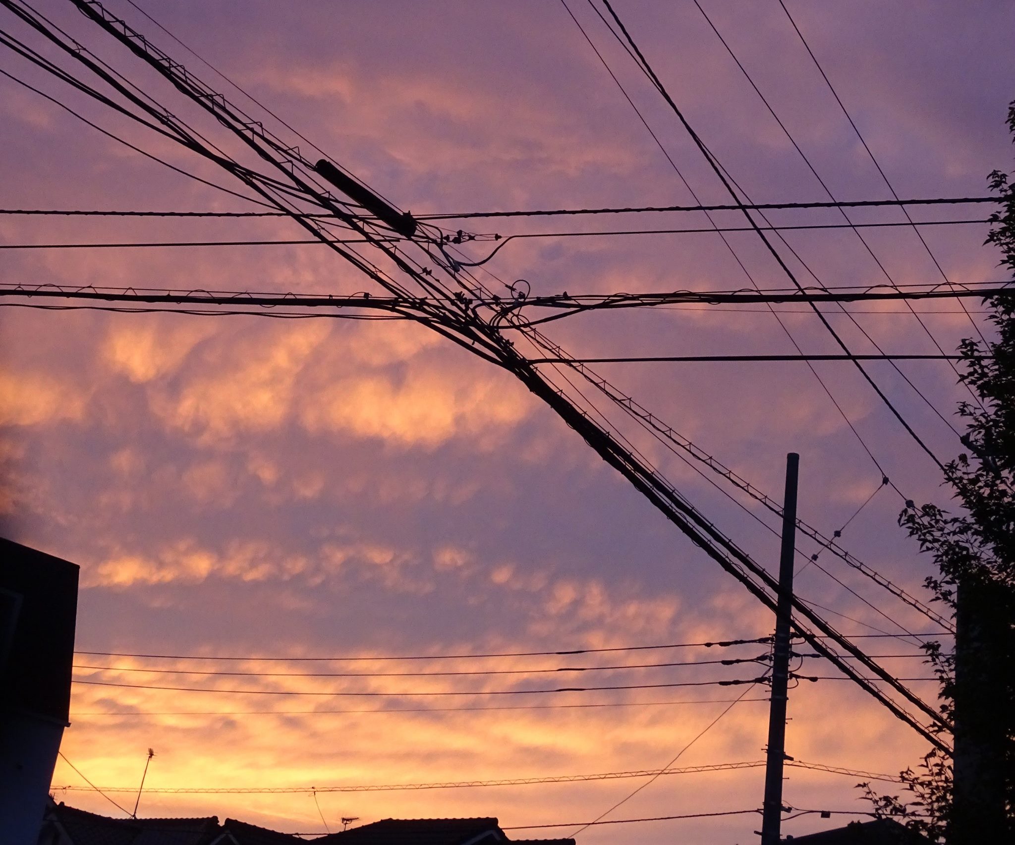 今、夕焼け。 皆さんがいる所のほうが、空が見渡せるかな。 きれいな夕焼けが見られそうな『前兆パターン』って、ありますよね。(狭山・ひろし事務所前にて)