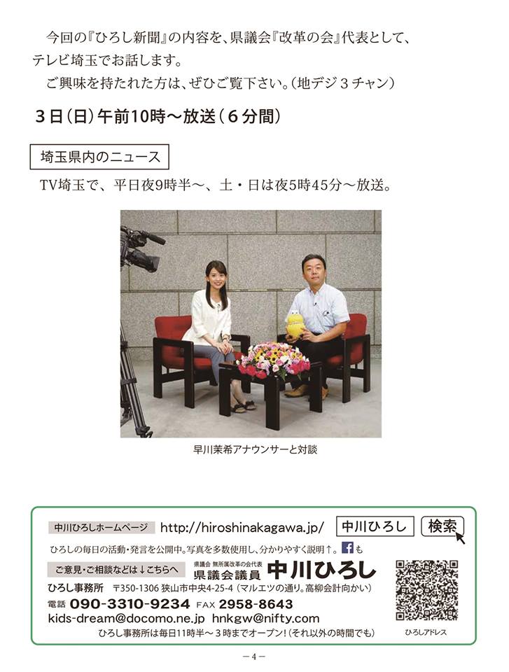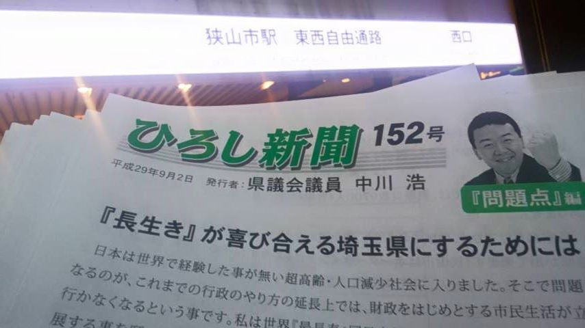 狭山市駅東口で今、『ひろし新聞152号』を配布中。